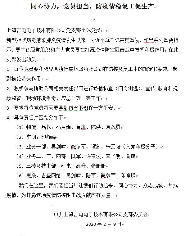 作為一家有責(zé)任的民營(yíng)企業(yè),同時(shí)發(fā)揮企業(yè)黨支部戰(zhàn)斗堡壘作用,發(fā)出了同心協(xié)力,黨員擔(dān)當(dāng),防疫情穩(wěn)復(fù)工促生產(chǎn)的倡議書。