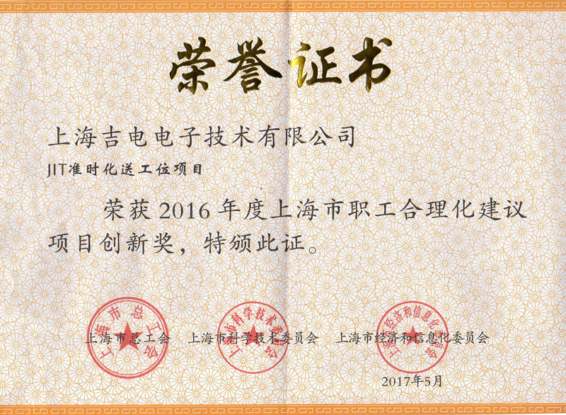 近期,上海吉電電子憑借《JIT準(zhǔn)時(shí)化送工位項(xiàng)目》在2016年度上海市職工合理化建議評(píng)選活動(dòng)中榮獲項(xiàng)目創(chuàng)新獎(jiǎng),該獎(jiǎng)項(xiàng)由上海市總工會(huì)、上海市科學(xué)技術(shù)委員會(huì)、上海市經(jīng)濟(jì)和信息化委員會(huì)聯(lián)合頒發(fā)。